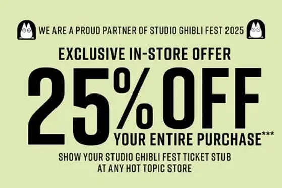 ***Discount available in U.S. Hot Topic stores only through November 30, 2025. Discount will be applied at the register in-stores. Must present a valid Studio Ghibli Fest 2025 ticket stub during checkout to qualify. One discount per customer. Cannot be combined with Hot Cash coupons, or any other offers, coupons, discounts, or promotions. Discount has no cash value. Exclusions apply, see https://www.hottopic.com/details or an associate for details.